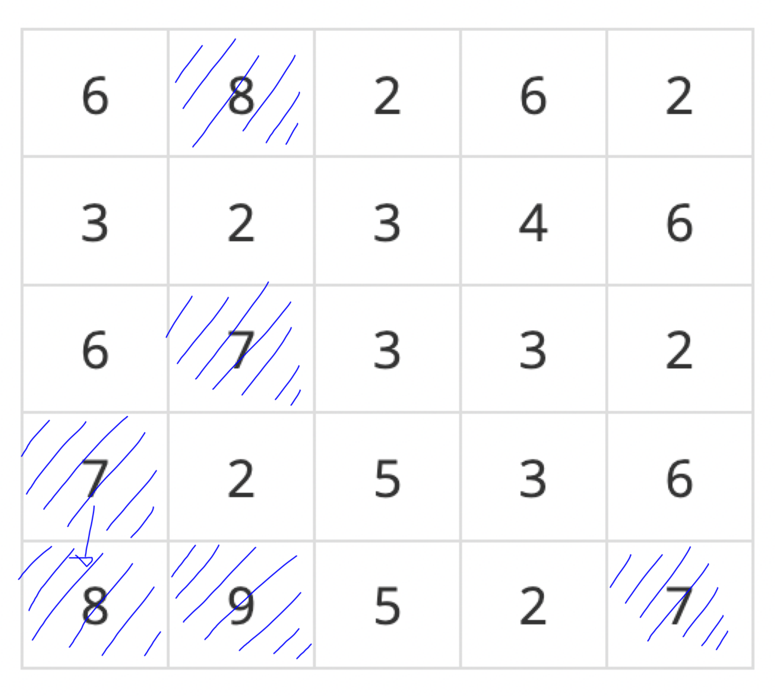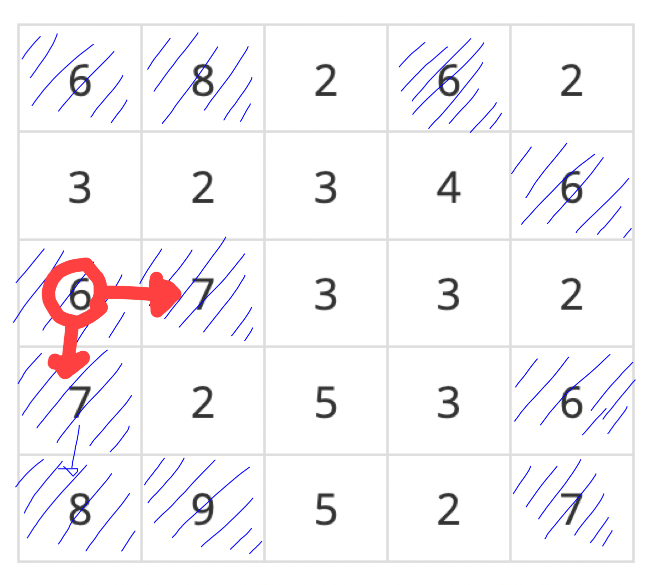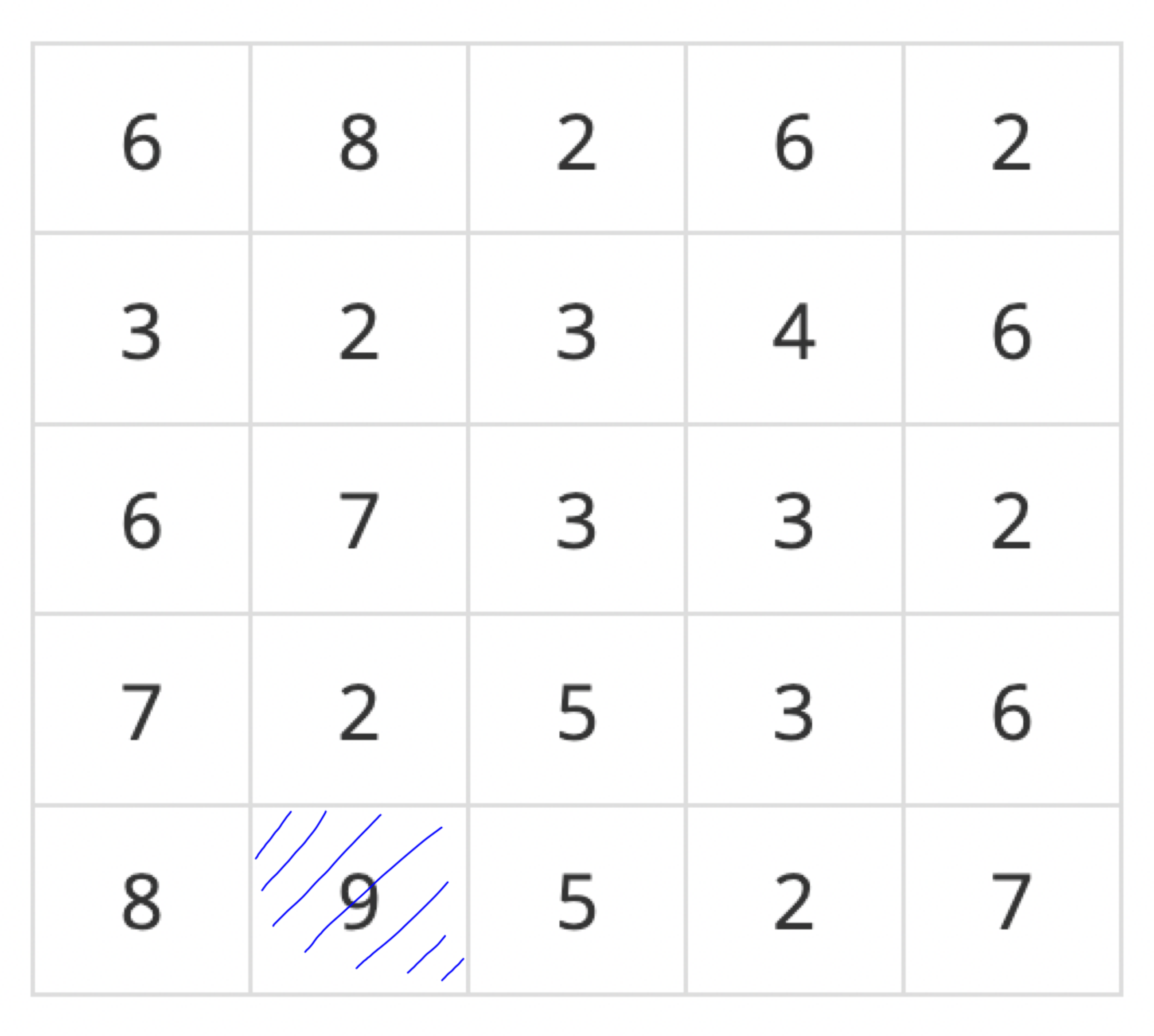초기에 위와 같은 지대별 높이가 주어집니다. 그러면 높이가 가장 높은 곳은 9이고, 가장 낮은 곳은 2가 됩니다.