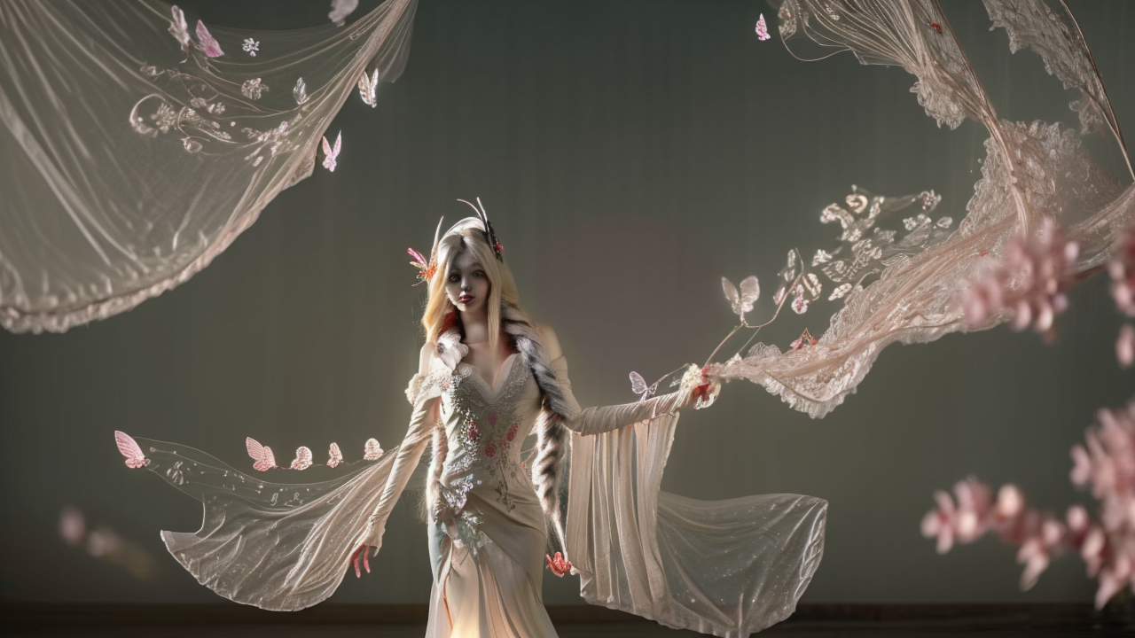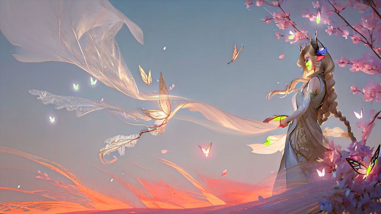 “A highly detailed and realistic 3D render of a graceful and elegant fantasy character with cat-like features, standing in a soft, glowing ethereal environment. The character has long, flowing blonde hair with intricate braiding, adorned with floral accessories. She wears a white, intricately designed gown with delicate lace and embroidery. Her expressive golden eyes gaze at a vibrant, detailed butterfly hovering nearby, with its iridescent wings reflecting light. The scene is softly illuminated, with petals floating in the air and a dreamy, diffused light setting the mood. Realistic skin texture, subtle fur details on her tail and ears, and lifelike fabric movement. Cinematic lighting and bokeh effects emphasize the character and butterfly while keeping the background soft and atmospheric.”