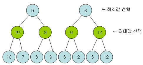 첫번째 수준에서는 최대값을 찾아서 9라는 값을 얻을 것이다. 두번째 수준에서는 갈 수 있는 경로에서 최소값을 찾아서 각각 9와 6이라는 값을 얻게 된다. 두번째 플레이어는 플레이1에게 불리한 방향으로 선택하는 것이 최선의 선택히기 때문이다. 세번째 수준에서는 최대값을 찾아서 각각 10, 9, 6, 12란 값을 가지게 된다. 마지막 노드에서는 정해진 방법에 따라서 점수를 계산한다.