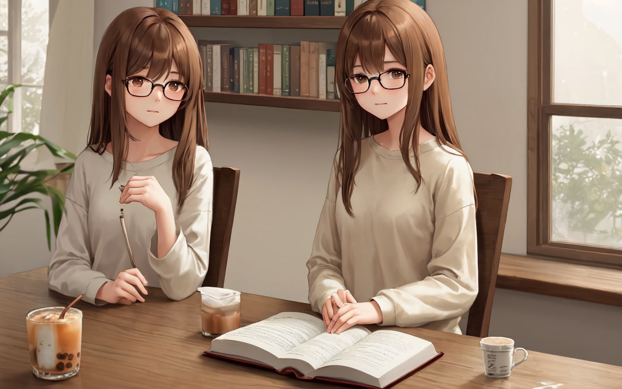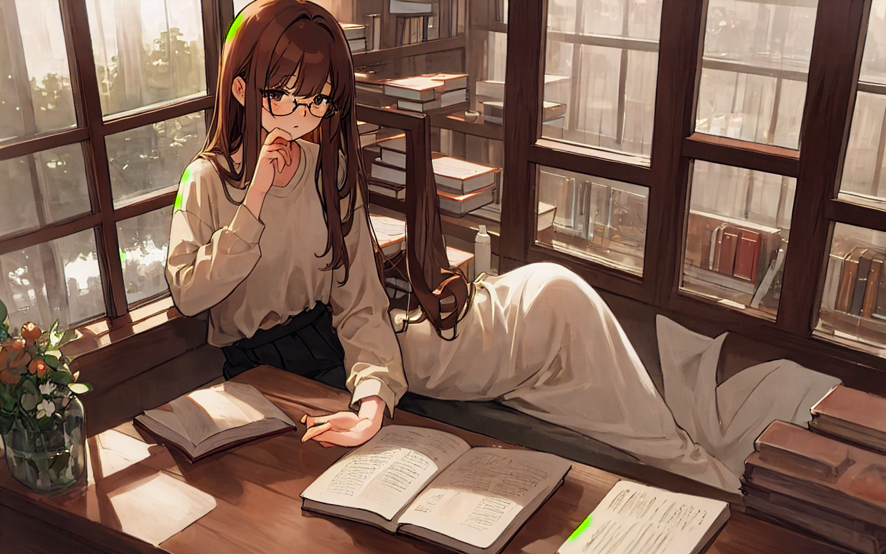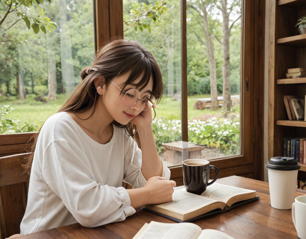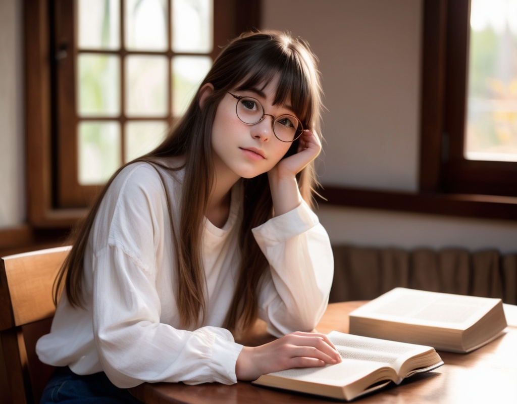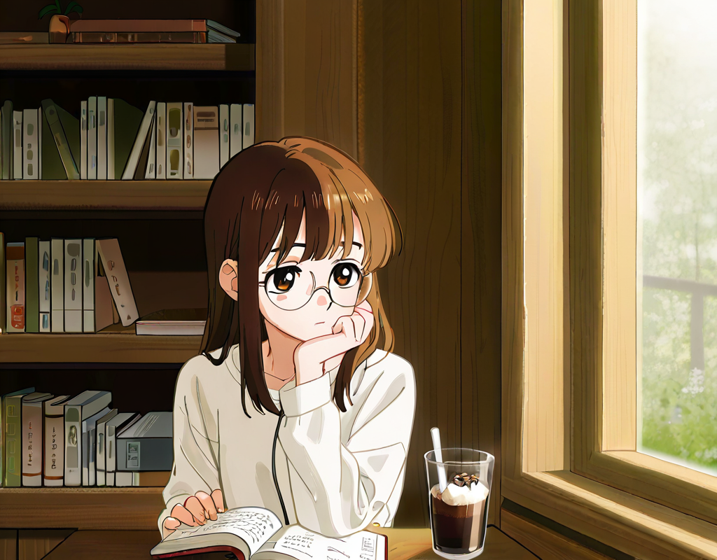 A serene scene of a young woman with long, brown hair and bangs, sitting at a wooden table in a cozy, dimly lit room. She is wearing round glasses and a simple white long-sleeve shirt, holding a book or manga in one hand while resting her chin on the other, gazing thoughtfully out of a nearby window. Soft, natural light streams in, creating gentle shadows and warm tones. On the table are a glass of iced coffee, a partially eaten dessert, a smartphone, and tangled earphones, adding a casual and relaxed touch. The background features shelves filled with books or manga, enhancing the peaceful, introspective atmosphere. The overall mood is calm, warm, and introspective, with soft, inviting textures and tones.